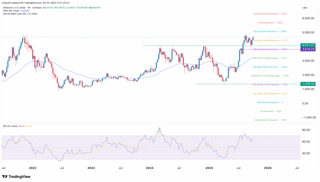 Atualmente, o Ethereum se aproxima da resistência máxima em US$ 5.000, que representa a barreira decisiva para a próxima perna de alta. Se esse nível for rompido, o modelo indica dois alvos potenciais: